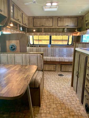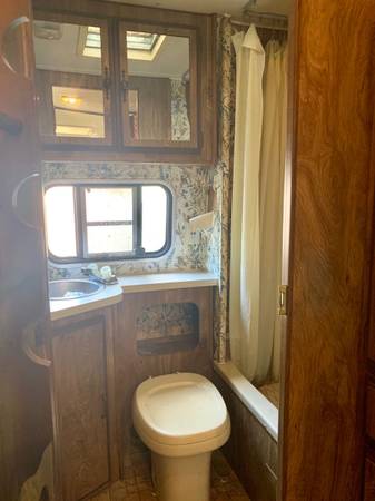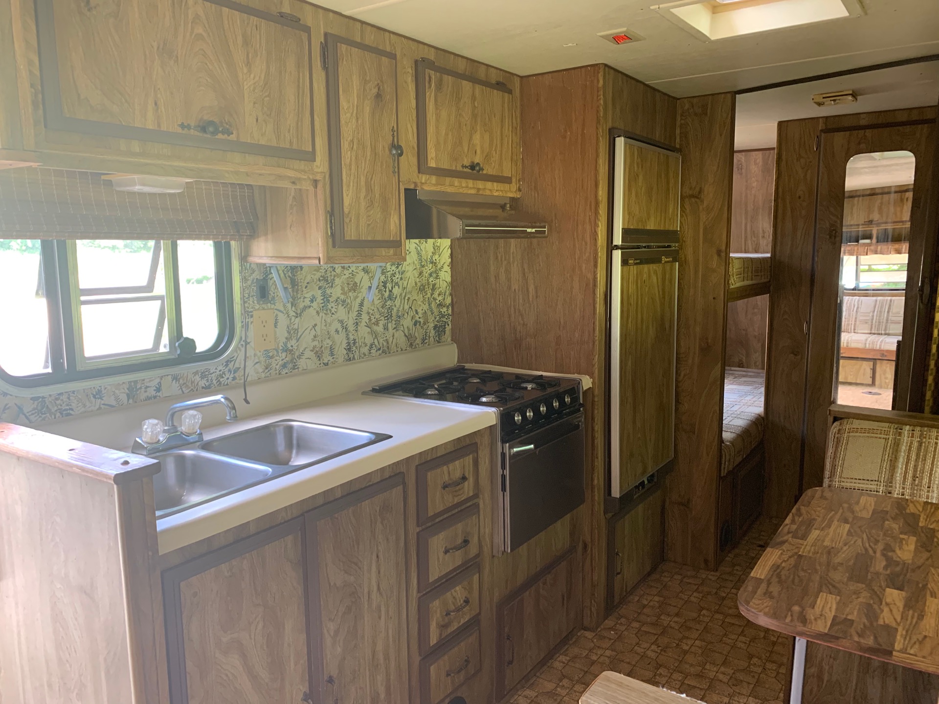 This adorable 23 foot, 1983 Shasta camper came equipped with a working oven, stove, fridge and freezer, hood vent, sink, full bathroom, and an amazing amount of storage. We loved everything about it and the layout is unlike any i've seen since. Its extremely functional, sleeps 6, had some original flooring and wallpaper, lots of wood paneling, and some pretty great old plaid cushion covers, and a whole lot of character.