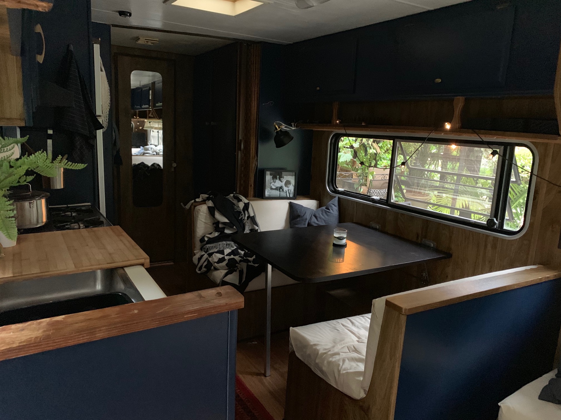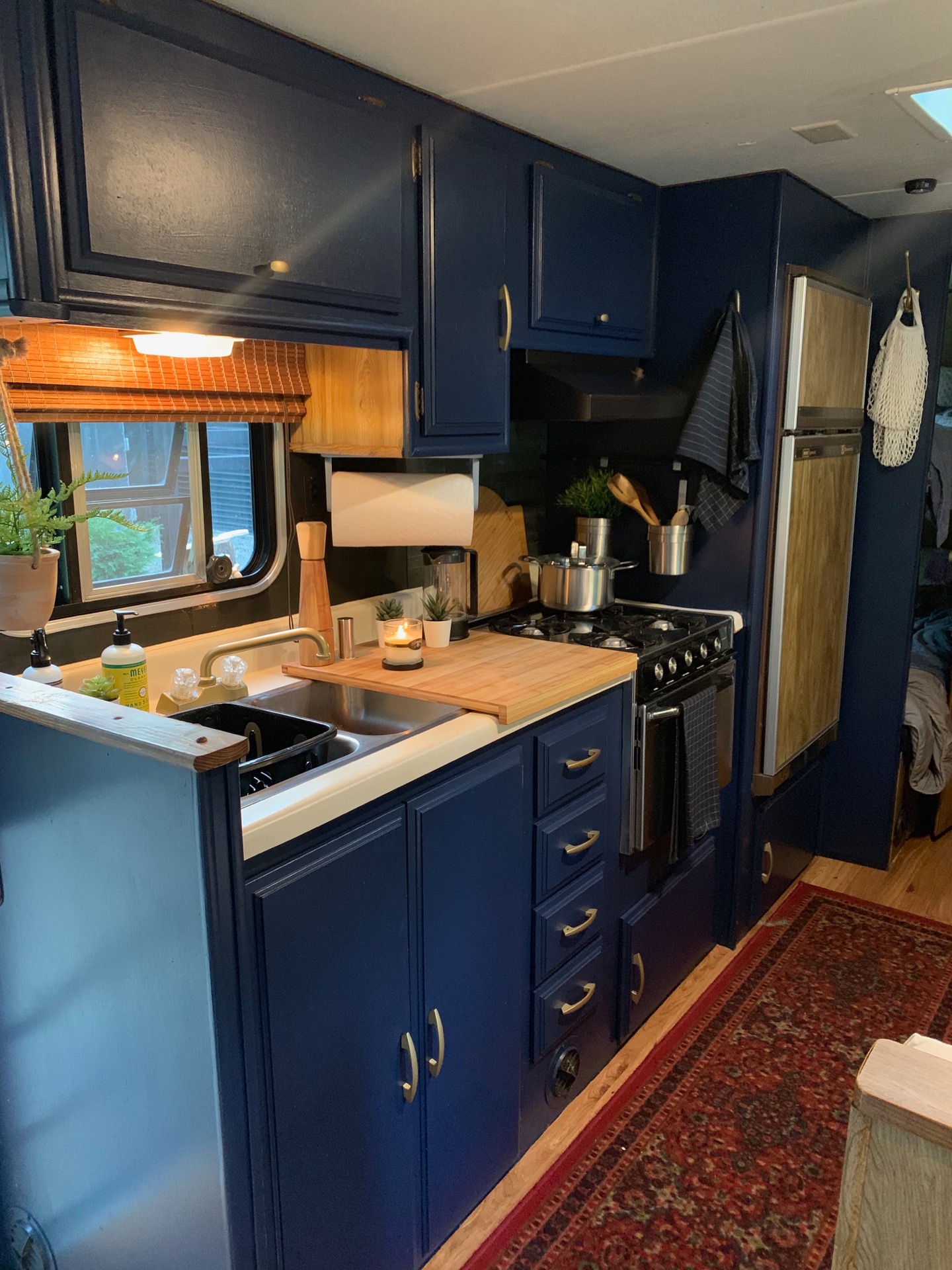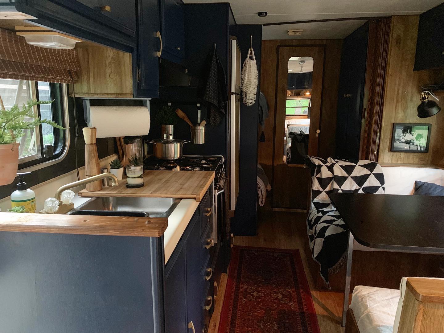 We put up new blinds in 6 of the windows, since the back has an exterior shade that closes with ease. A lot of the functional decor came from Ikea. Remember, Ikea is a store made for small living spaces, with great functional storage, which in turn looks nice too. In a camper, we are looking for the best bang for the buck, with the most versatility. There is a great cutting board (18x20") that's used in here and worked seamlessly with the aesthetic of the camper. (https://www.ikea.com/us/en/p/laemplig-chopping-board-bamboo-00309829/ )