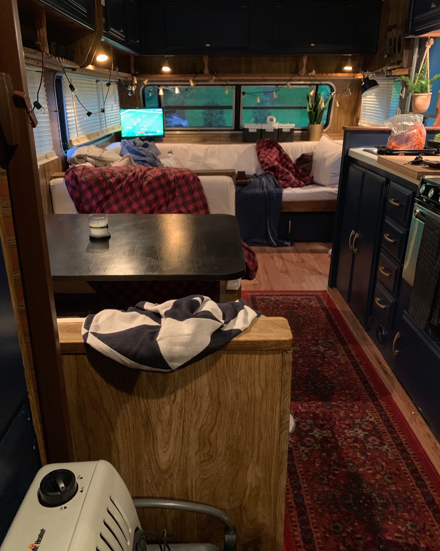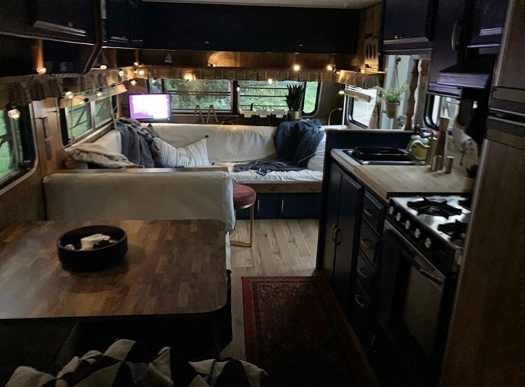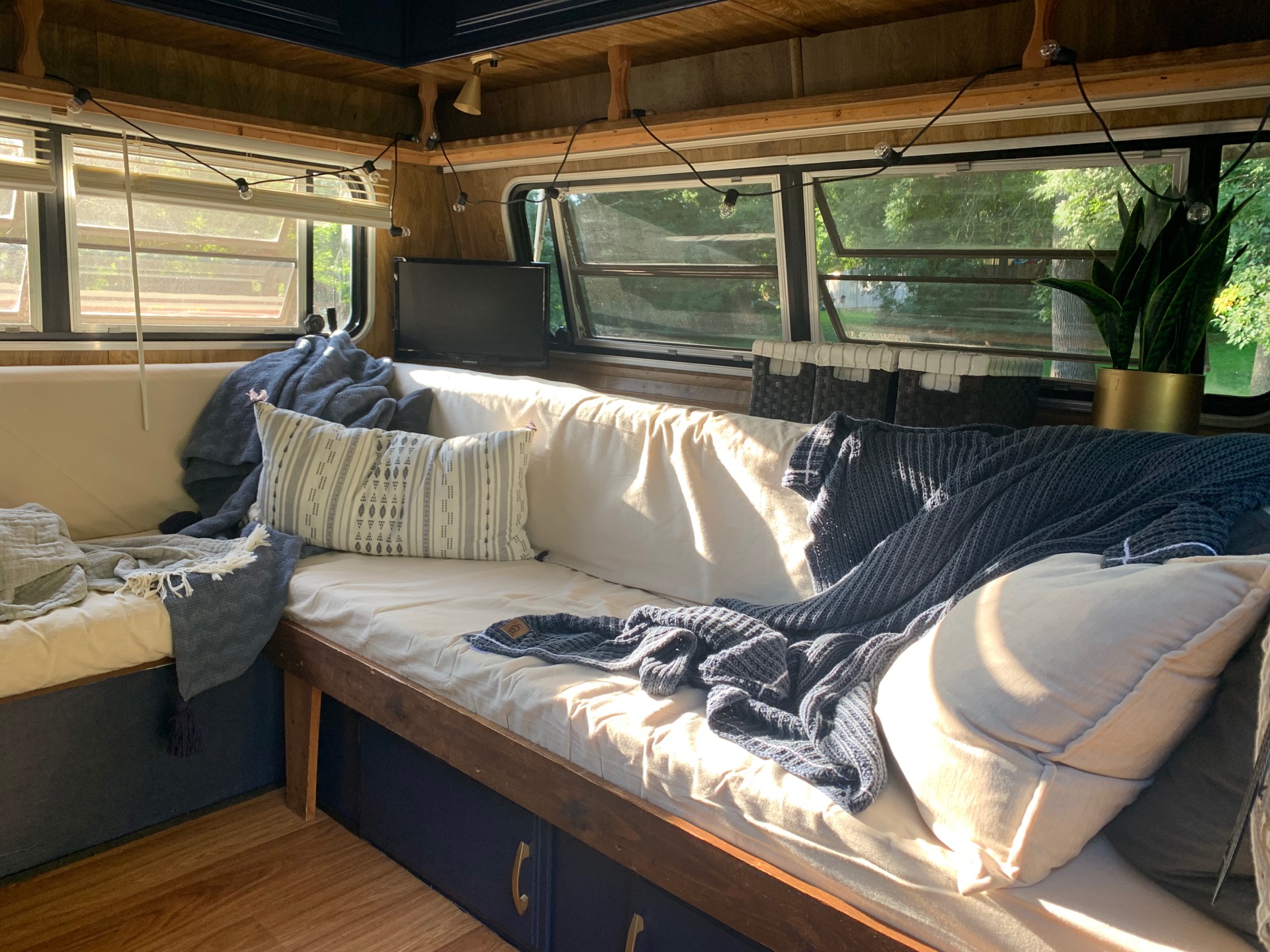 We put up new blinds in 6 of the windows, since the back has an exterior shade that closes with ease. A lot of the functional decor came from Ikea. Remember, Ikea is a store made for small living spaces, with great functional storage, which in turn looks nice too. In a camper, we are looking for the best bang for the buck, with the most versatility. There is a great cutting board (18x20") that's used in here and worked seamlessly with the aesthetic of the camper. (https://www.ikea.com/us/en/p/laemplig-chopping-board-bamboo-00309829/ )